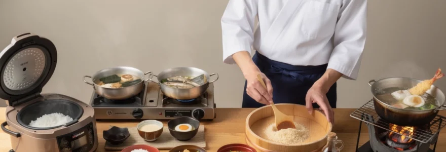 Obtenir un riz parfaitement cuit relève d’un véritable savoir-faire. Dans la plupart des foyers, on utilise aujourd’hui un cuiseur électrique appelé suihanki, capable de gérer précisément le temps de cuisson et de repos. Il suffit de rincer soigneusement le riz jusqu’à ce que l’eau devienne presque claire, de respecter la bonne proportion eau/riz, puis de laisser l’appareil travailler. Cette méthode moderne garantit une qualité constante tout en s’adaptant aux rythmes de la vie urbaine.
