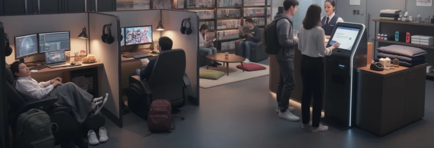 La variété des configurations répond à différents usages et budgets. Les open seats, situées dans l’espace commun sans cloison, représentent l’option la plus économique, idéale pour une consultation rapide de manga ou une navigation internet de courte durée. À l’opposé du spectre, certains établissements haut de gamme proposent des premium booths entièrement fermés avec porte, insonorisation renforcée et même des lits doubles pour les couples. Ces espaces peuvent facturer jusqu’à 500 yens de l’heure, contre 150-200 yens pour un box standard. La chaîne Hai