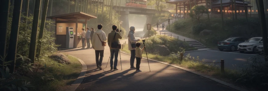 Les groupes touristiques organisés jouent un rôle central dans la perception de la foule à Arashiyama. Un seul groupe de 40 à 50 personnes peut rapidement saturer un segment du sentier principal de la bambouseraie, surtout lorsque des pauses photo prolongées s’improvisent au cœur du couloir de bambous. La plupart de ces groupes arrivent en bus entre 9h30 et 11h le matin, puis à nouveau entre 14h et 16h l’après-midi, suivant les horaires classiques des tours au départ de Kyoto et d’Osaka.
